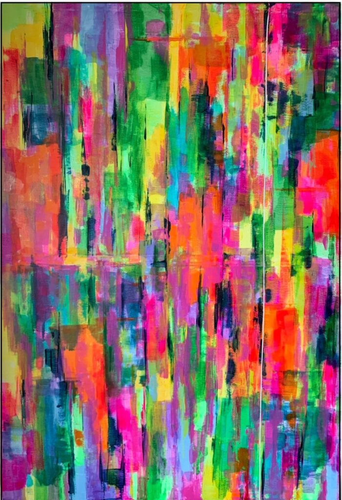 Hay una apuesta fuerte por el color neón y por la saturación intensa que remite a una energía eléctrica. Busco conectar con lenguajes urbanos, digitales, incluso musicales. Me atrae, especialmente, esa tensión entre el exceso y la calma: cómo incluso el ritmo visual –cuando se trabaja desde la intención y el ritmo- pueden abrir un lugar para la contemplación, una forma inesperada de silencio.
