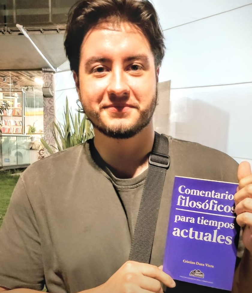 Y a Cristian Zapata, el mismo día del natalicio de Emiliano, el mexicano, le hicimos esta foto. Con su libro –o con la Portada de ese libro conduciéndolo alegre–, en la performance efectiva d’un nuevo encuentro de la tradición filosófica desde esa Grecia antigua. ¿La escena? Una talvez versión de Sócrates deteniendo a los transeúntes cohabitantes de su polis-ciudad. Para compartir palabras acerca del pasado, el presente y el porvenir de unos humanos sobre un planeta lleno y complejo de asuntos… Como si otra vez hicieran falta unos pensadores en las ciudades, los campos y las playas…