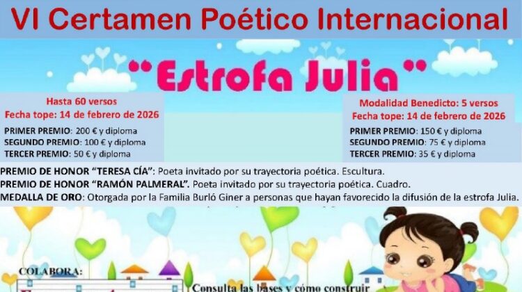 Hace unos días, al entrar en la página web de Escritores.org, me encontré con un concurso de poesía que me ha perecido muy interesante. Se denomina “CERTAMEN POÉTICO INTERNACIONAL ESTROFA JULIA”, diseñado, creado y dirigido por Dª. Consuelo Giner Tormo, doctora en Filosofía y licenciada en Filología Hispánica, además de poeta.