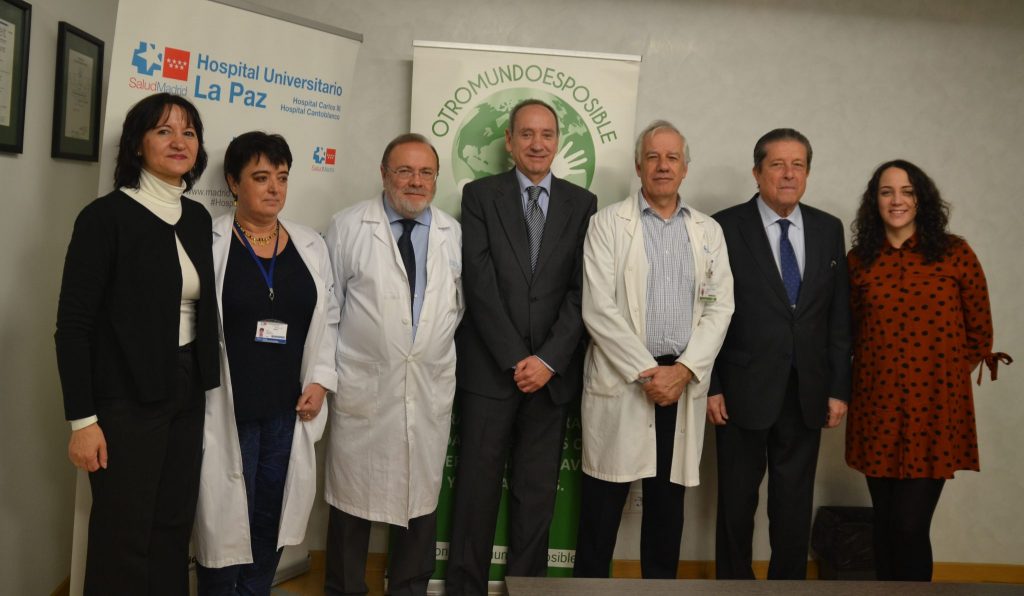 Foto: Federico Mayor acompañando a miembros de Ong otromundoesposible en el acto de entrega de un electrocardiógrafo a la unidad de hemato-oncología pediátrica del hospital La Paz, de Madrid