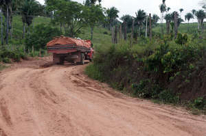 Los camiones de los madereros, cargados de madera, salen de la selva de los awás día y noche. © Survival