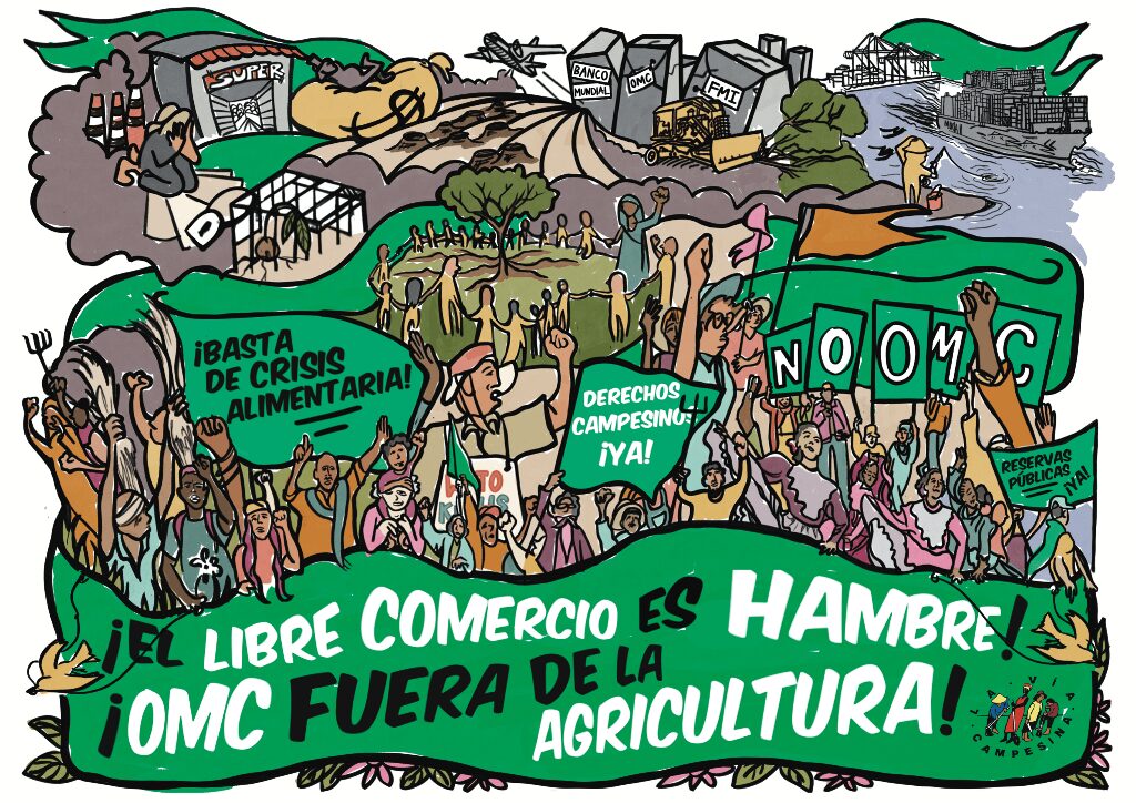 Según La Vía Campesina, la OMC «se ha convertido en un espacio donde prevalece la Regla del Poder, con pocos países desarrollados determinando el curso del comercio mundial». Y por esta razón, concluye, «a pesar de la firmeza del Sur Global, la misma permanece estancada en un limbo, aparentemente cavando su propia tumba». Y reitera su oposición a todos los Tratados de Libre Comercio que pongan en peligro la Soberanía Alimentaria de un país, socaven la autonomía y la autosuficiencia de las economías locales y tengan efectos adversos en la vida, las condiciones de vida y los salarios de todos los-las trabajadores-as, incluidas las personas migrantes y las mujeres (https://viacampesina.org/es/26-29-de-febrero-la-via-campesina-convoca-a-una-semana-de-movilizacion-contra-la-omc/).