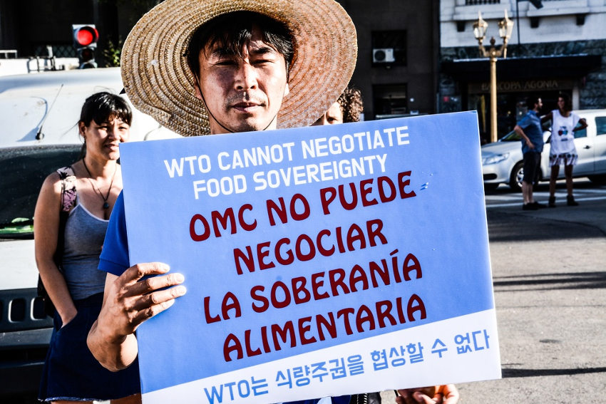 La Vía Campesina denuncia la incapacidad de la OMC durante más de una década «para alcanzar un consenso sobre una solución duradera para las existencias públicas de alimentos a pesar de que más de 80 países en desarrollo han presentado propuestas detalladas». Lo que ilustra claramente la alineación [de la OMC] con los intereses de los Estados Unidos y otros países fuertemente orientados a la exportación».