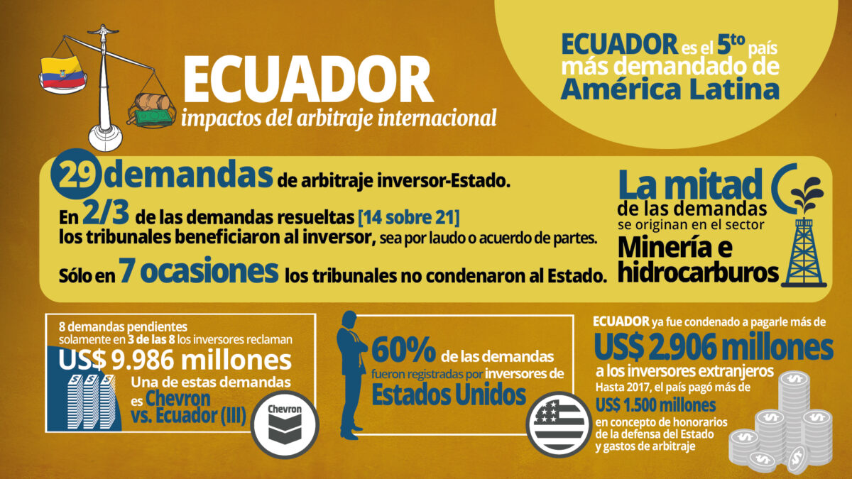 Ecuador, con veintinueve demandas en su contra, es el quinto país más enjuiciado en América Latina por parte de los inversores extranjeros. Demandas que se generan, principalmente, en el sector de las empresas extractivas de recursos naturales, así como de gas y electricidad.