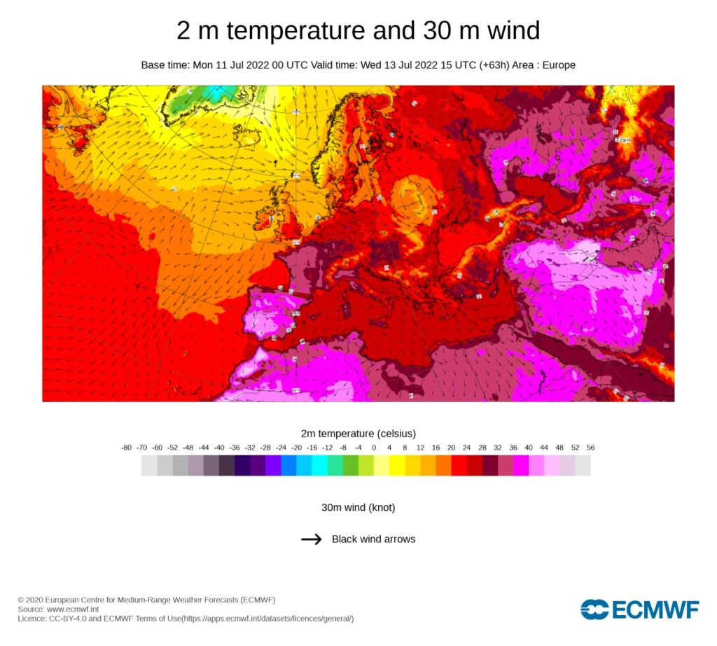 Por su parte, la Agencia Estatal de Meteorología española (AEMET), informó el tercer miércoles de julio, que la «anomalía» — la diferencia entre la temperatura que puede considerarse como ola de calor y la realmente registrada — fue muy alta: 4,2 grados en el país ibérico. Anomalía que supera a la de agosto de 2021 y que representa un récord desde que comenzaron las mediciones, en 1975.
