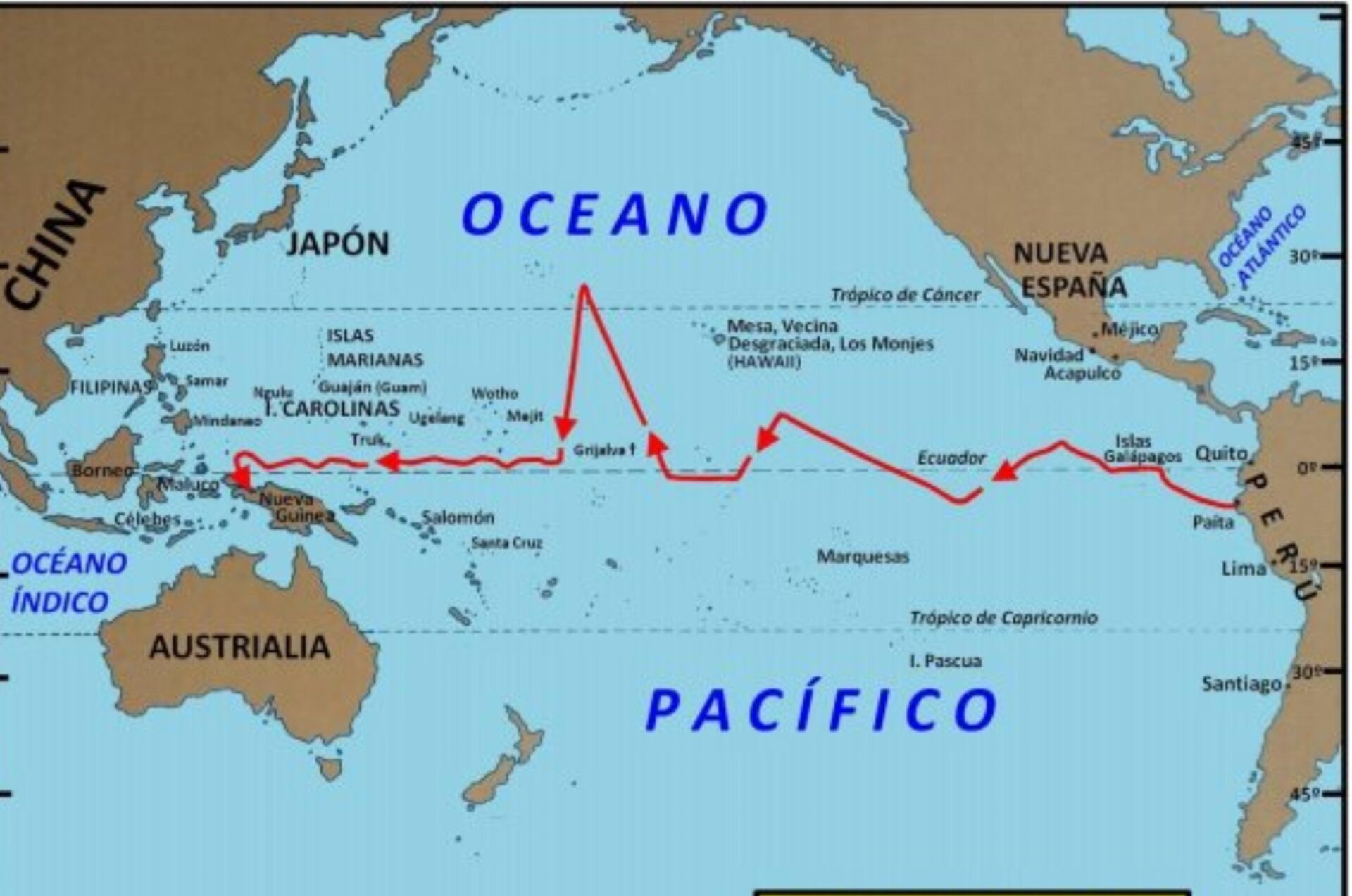En las primeras semanas caminaron prácticamente sobre la línea ecuatorial, pero al no hallar islas tentaron las latitudes de 13° al S; y 24° al N., sin mayor fortuna. La falta de agua y víveres, así como algunas averías en el aparejo, les decidieron a iniciar el regreso a Nueva España. Habían transcurrido varios meses. Vientos fríos y chaparrarrones les impidieron avanzar y forzaron un racionamiento angustioso. Grijalva propuso insistir en el tornaviaje, pero finalmente prevaleció la opinión de los más: poner rumbo a las Molucas sin apartarse de la equinocial. Habían muerto el piloto Martín de Acosta y muchos otros tripulantes.