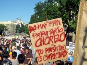 En la Puerta del Sol en Madrid se exhibe un cartel que dice: No hay pan para tanto chorizo y de eso hablan los concentrados en distintas capitales. Y para evitar que sus conversaciones afecten la voluntad de los votantes la Junta Electoral Central ha tomado el acuerdo  de prohibir las concentraciones el fin de semana. Ustedes se preguntaran ¿y la libertad de expresión?Pues precisamente de eso tratan los movimientos de ir consiguiendo, paso a paso, una democracia real, tanto en participación como en derechos. Lo otro amigos, es sólo la sombra de aquello que pudo haber sido y que todavía no es.