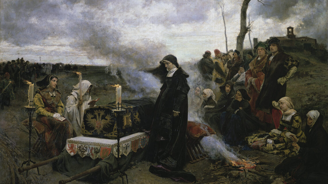 El magnífico cuadro pintado por Francisco Padilla en el siglo XIX, y que podemos admirar en el Museo del Prado, no refleja sin embargo la realidad, sino la versión romántica de una mujer que por azar del destino se encontró con un reino que en principio no era para ella y que aunque estaba sumamente preparada, no deseaba gobernar. Apodada “la Loca”, ha sido una de las figuras femeninas más maltratadas de la historia de España.Según la R.A.E., loco, ca, en su primera acepción significa “Que ha perdido la razón. U. t. c. s.” y en su segunda “De poco juicio, disparatado e imprudente. U. t. c. s.”.Nada de esto se puede atribuir a la reina Juana, sí es posible que con el tiempo pudiera desarrollar una demencia senil, consecuencia inevitable del envejecimiento, pues hay que tener en cuenta que para los estándares de la época fue una mujer muy longeva, pero nada en sus actos a lo largo de su vida nos indica que sus facultades mentales estuvieran perturbadas.Juana, tercera hija de Isabel y Fernando, vino al mundo un seis de noviembre de 1479 en la noble ciudad de Toledo. Su infancia estuvo marcada por los grandes acontecimientos de finales del siglo XV, a la sazón la toma de Granada y el descubrimiento de unas nuevas tierras más allá del océano. De carácter extrovertido y sensible, nunca fue comprendida por su madre que se encargó, eso sí, de darle una educación acorde con su rango, pero no estaba destinada a reinar, si no a convertirse en consorte de algún príncipe o monarca extranjero. Juana recibió una educación cristiana (al estilo de la época) a la par que humanista, hablaba a parte del castellano, francés y latín, llegando a reunir una interesante biblioteca (al igual que su madre), que se llevaría consigo hasta su retiro en Tordesillas. A nivel familiar fue testigo de los ataques de celos iracundos de su madre, por culpa de las infidelidades de su padre, aunque muy controlados y comprendidos por todos, no en vano era la reina.                   Esos mismos celos en Juana, al no admitir las aventuras de su marido, no serán entendidos en la corte borgoñona, comenzando a forjar su leyenda de locura.Desde el principio la obsesión de los reyes católicos fue la unidad de la Península Ibérica bajo una sola dinastía y el traspaso de esa herencia a sus descendientes; el primer paso fue el matrimonio entre ambos, que daría lugar a que uno de sus hijos fuera el heredero de ambas coronas, después vino la guerra de Granada, la cual fue anexionada a Castilla, el tercer paso era Portugal, para ello su primogénita Isabel, casaría con el príncipe heredero Alfonso, hijo de Juan II de Portugal, pero Alfonso moriría al poco por culpa de una caída del caballo, tras lo cual la reina católica dio un paso más al concertar un nuevo matrimonio de Isabel con Manuel I de Portugal, para lo cual hubo que convencer a la novia pues esta había anunciado que no volvería a casarse, haciendo vida religiosa. A la vez se negociaba un doble enlace que reforzaba los lazos entre Castilla y Aragón con el Sacro Imperio, casando a Juan, el heredero, con Margarita y a Juana con Felipe, ambos hijos de Maximiliano de Austria.                                    Tercera en la línea de sucesión, Juana fue utilizada como pieza clave en la política de alianzas que a través del matrimonio reforzaría a ambas coronas ante su gran enemigo, Francia.Nuestra protagonista no estaba destinada a reinar, solo sería consorte de un simple duque, pues Felipe era duque de Borgoña y conde de Flandes, sometido al mandato del emperador, título que era electo, por lo que en un futuro podía ser emperador como lo fue su padre o no. La pareja, apenas unos adolescentes, tuvieron una atracción tal al conocerse, que obviando todos  los protocolos pidieron al capellán de la infanta Diego Ramírez de Villaescusa, que los casara para consumar su matrimonio. Pronto vinieron al mundo Leonor en 1498, Carlos en 1500 e Isabel en 1501, Juana ha cumplido con creces su papel y Felipe una vez garantizada su descendencia comienza a cortejar a otras mujeres, sorprendiéndose de que su mujer no admita el hecho, tal y como se admitía en la corte borgoñona, que el duque tuviera otras amantes. Las peleas entre los dos son constantes, no entendiendo nadie en dicha corte sus continuos ataques de celos, a lo que el duque reaccionara encerrado a su esposa en sus habitaciones.