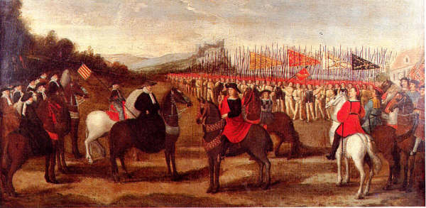 Entrevista de Remesal de Sanabria, pintura sobre tabla, mediados del S. XVI, Chateâu de La Follie, Bruselas. Fernando a la izquierda con su reducido séquito y humildes atuendos. Felipe a la derecha, con gran despliegue de soldados y nobles, con lujosas vestimentas.