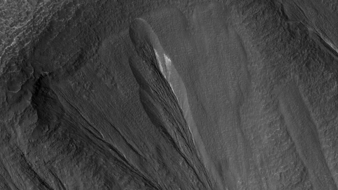 Se cree que los bordes blancos de estos barrancos en Terra Sirenum, en Marte, son hielo de agua polvoriento. Los científicos creen que el agua derretida podría formarse debajo de la superficie de este tipo de hielo, lo que proporcionaría un lugar para la posible fotosíntesis. Esta es una imagen con colores mejorados; el color azul en realidad no sería perceptible para el ojo humano. Credits: NASA/JPL-Caltech/Universidad de Arizona